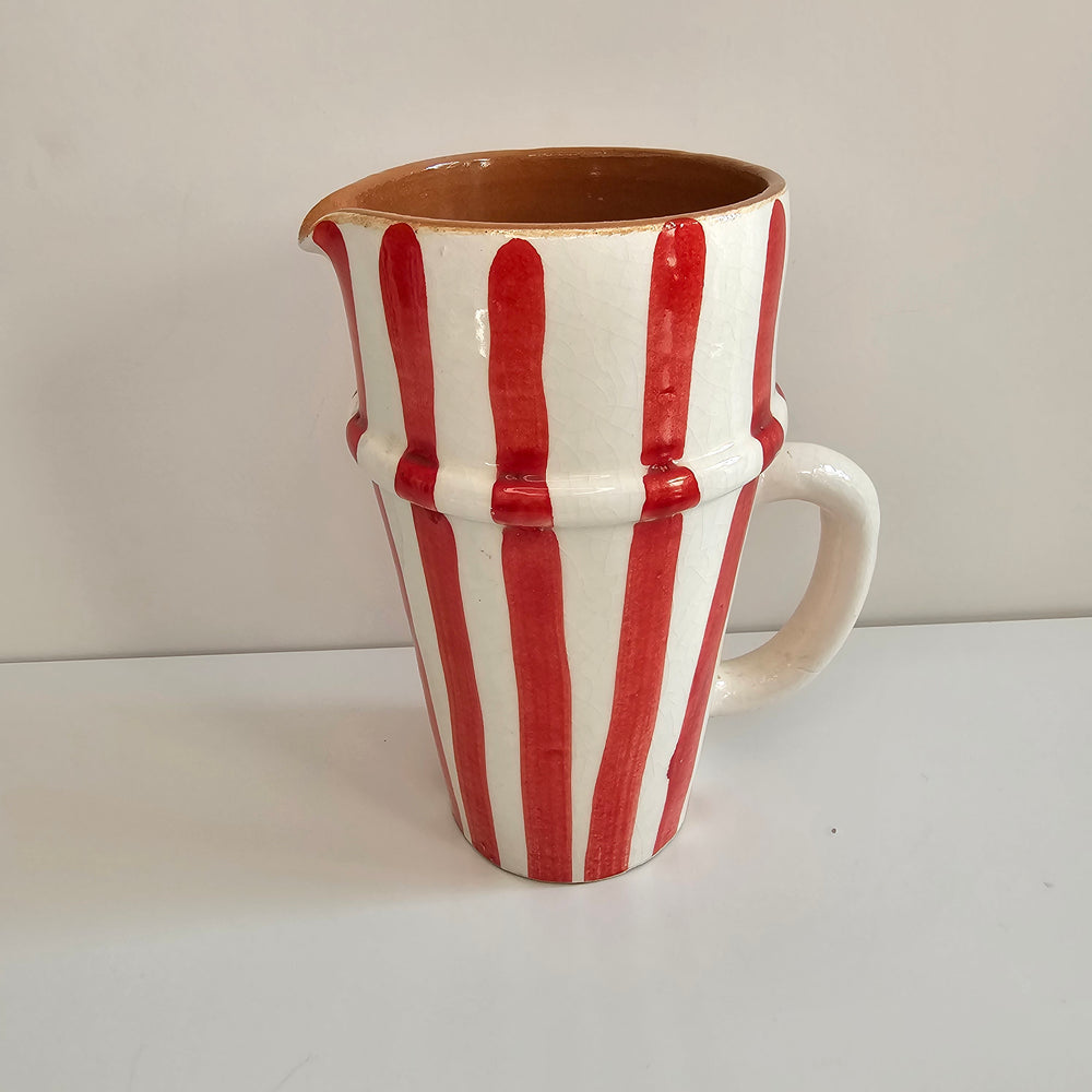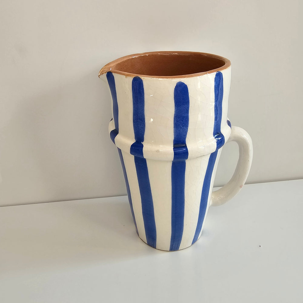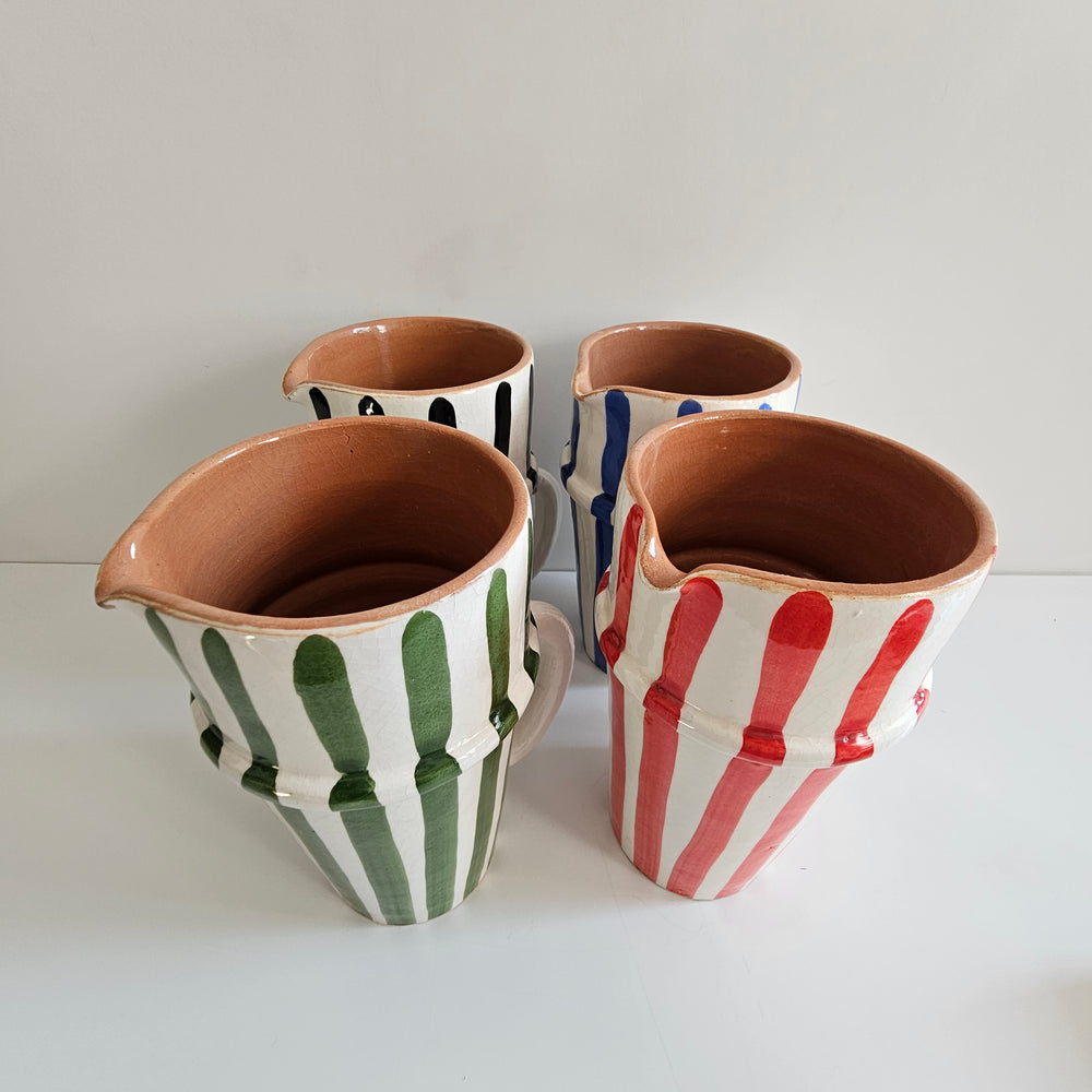 Add a handcrafted and graphic touch to your kitchen with the "Tifinagh Stripes" carafe. Handcrafted and decorated, this carafe made from natural Moroccan clay features a vertical pattern painted in four colors: Majorelle blue, Saffron red, Atlas green, and Ebony black. The raw interior contrasts with the striped exterior, for an authentic and contemporary piece.