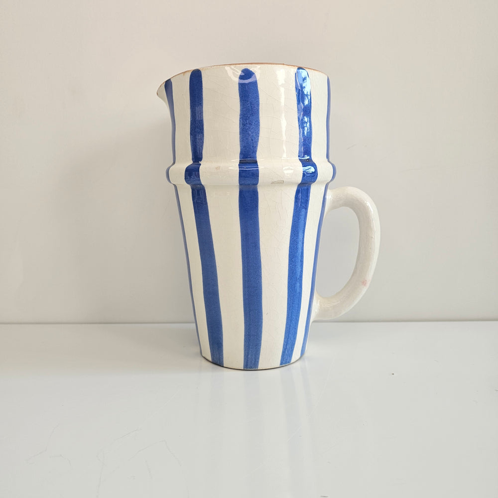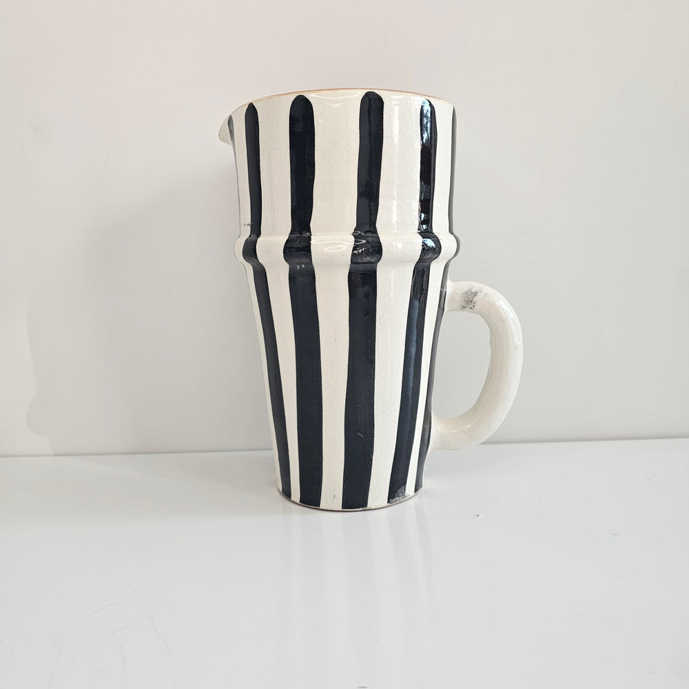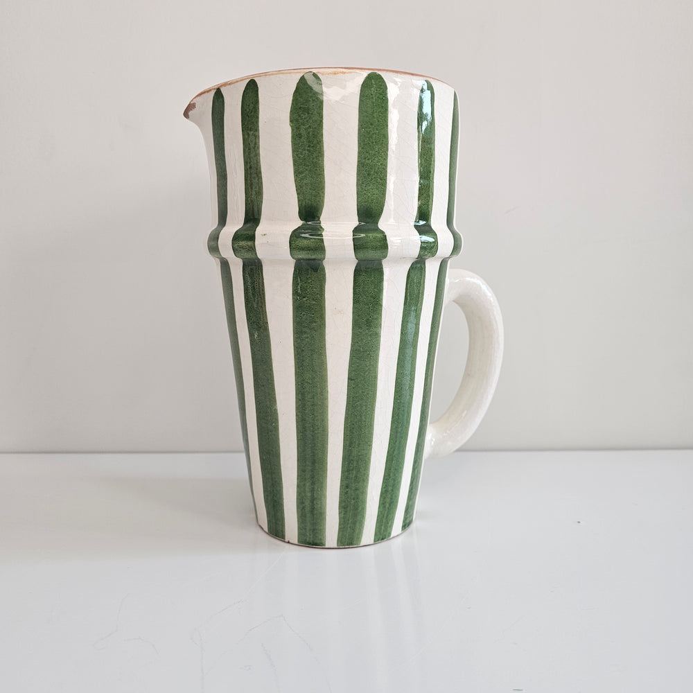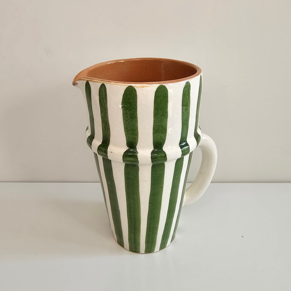 Add a handcrafted and graphic touch to your kitchen with the "Tifinagh Stripes" carafe. Handcrafted and decorated, this carafe made from natural Moroccan clay features a vertical pattern painted in four colors: Majorelle blue, Saffron red, Atlas green, and Ebony black. The raw interior contrasts with the striped exterior, for an authentic and contemporary piece.