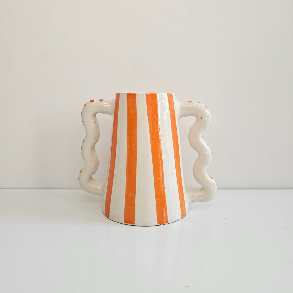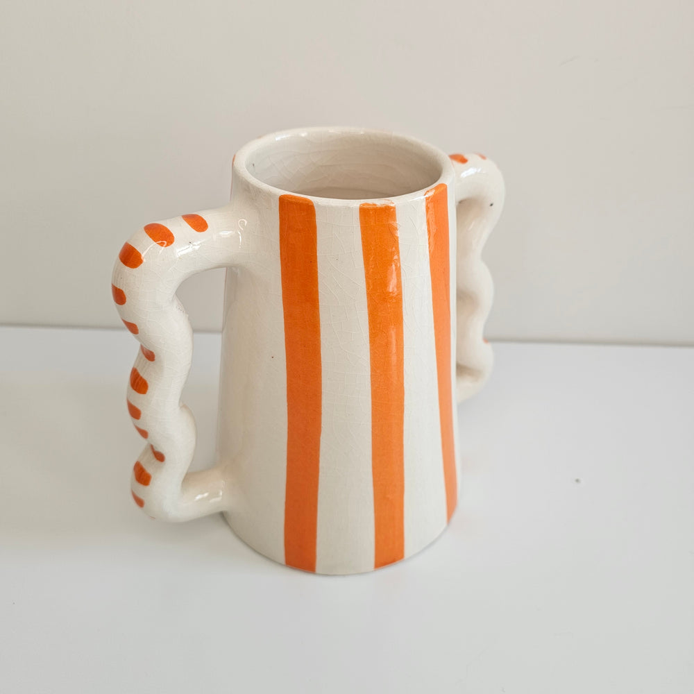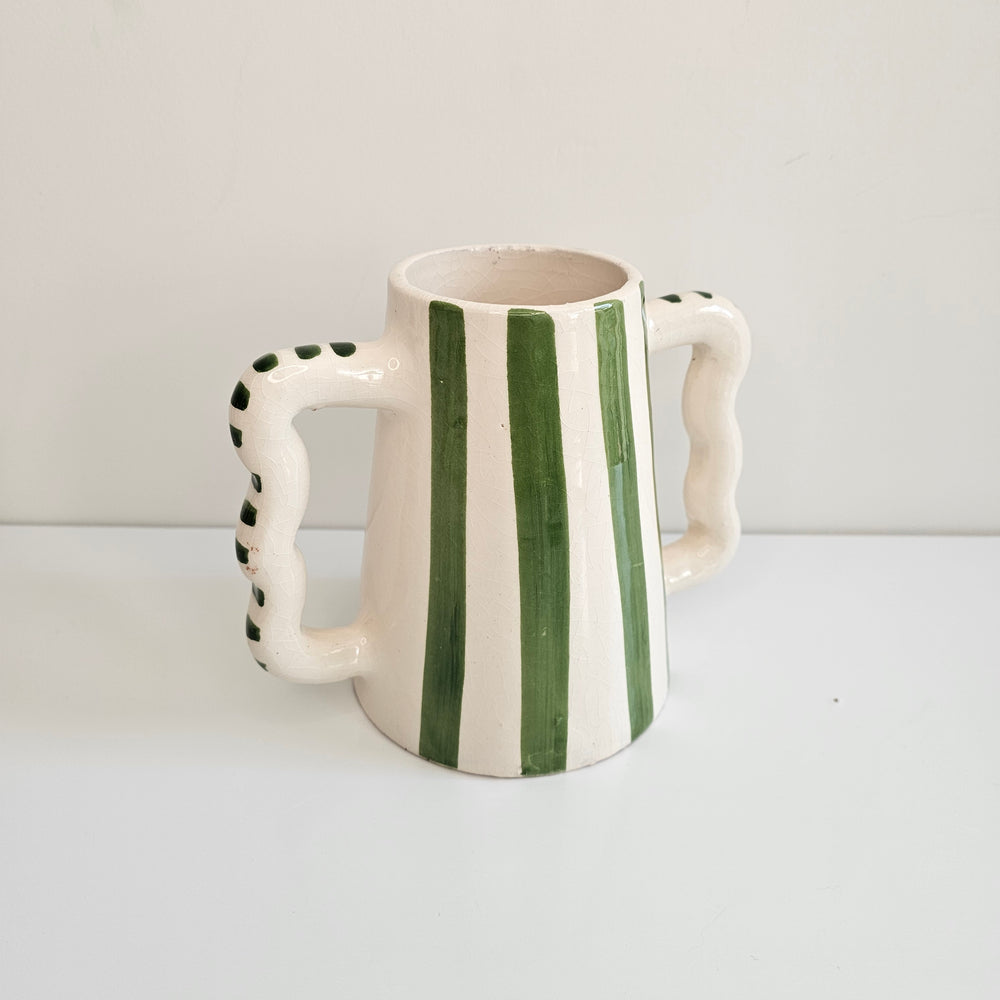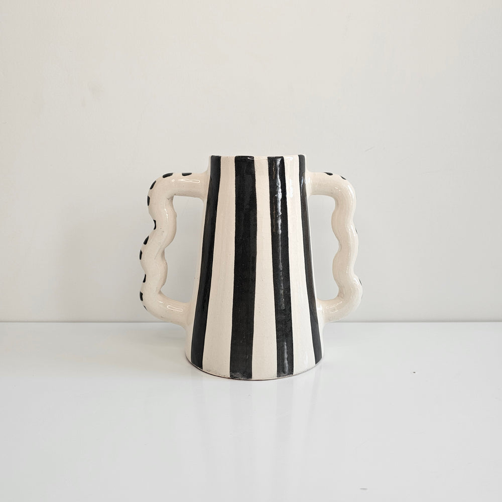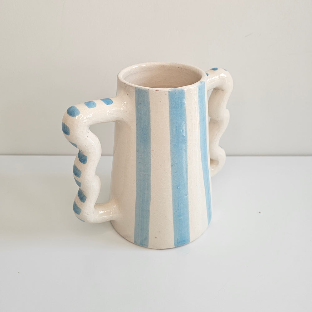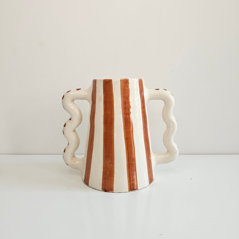 Dare to experiment with the "ZigZag Amazigh" pitcher: a ceramic carafe with a colorful striped pattern and sculptural twisted handles. Handcrafted and painted in Morocco, it's available in five bright and original variations to add character to any table.