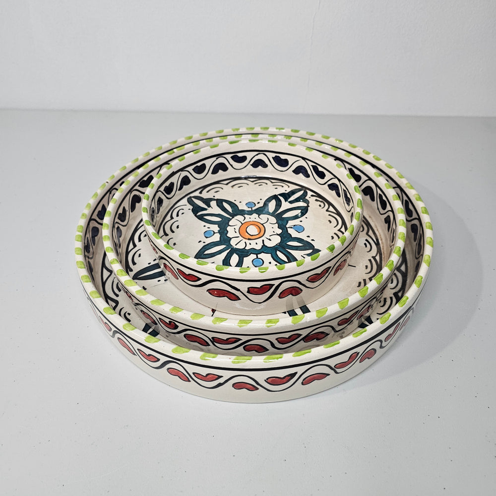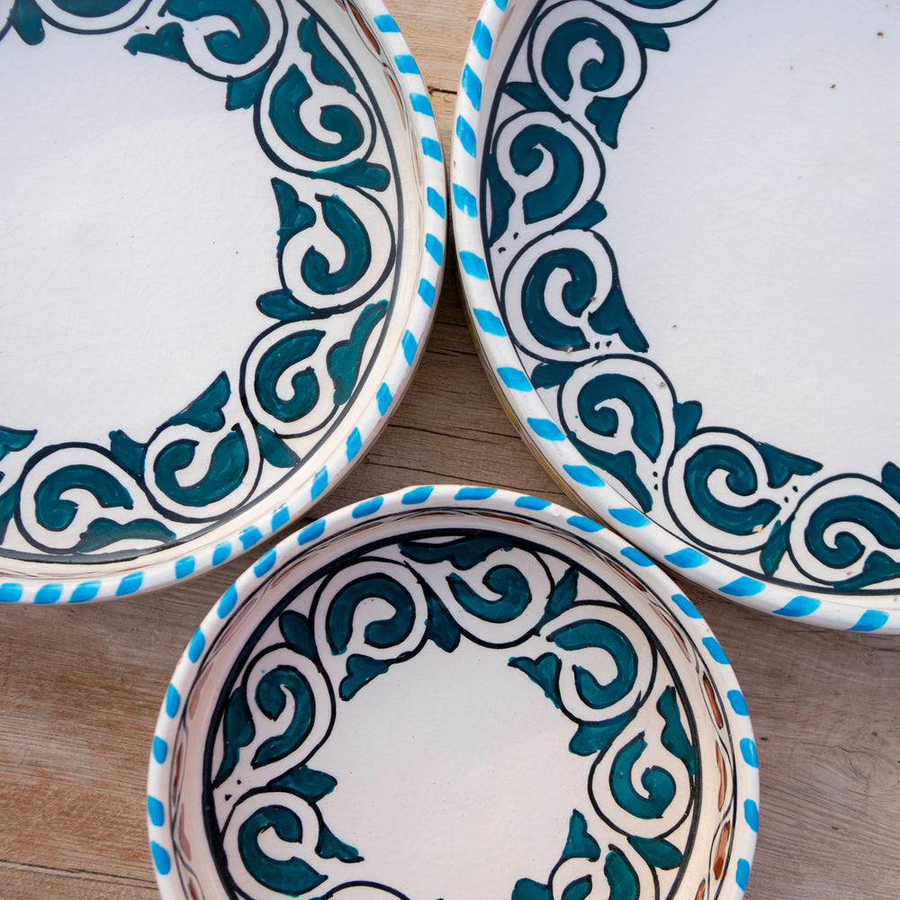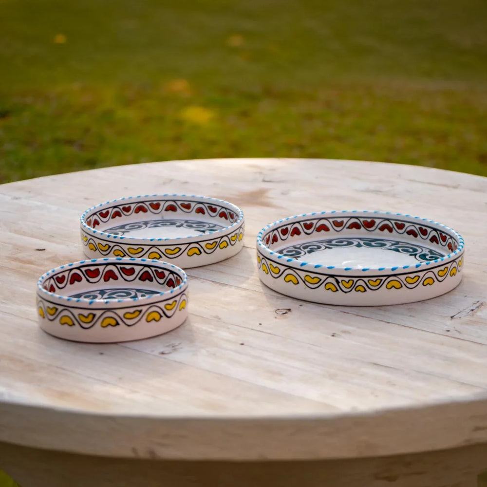 Enhance the conviviality of your meals by welcoming the raw sunshine of Morocco with the "Sun of Essaouira" set: three round bowls, hand-decorated with stylized Berber heart motifs, evoking the generosity and warmth of Moroccan tables. Perfect for appetizers, desserts, or fresh fruit, they transform every shared moment into a celebration of the art of living.