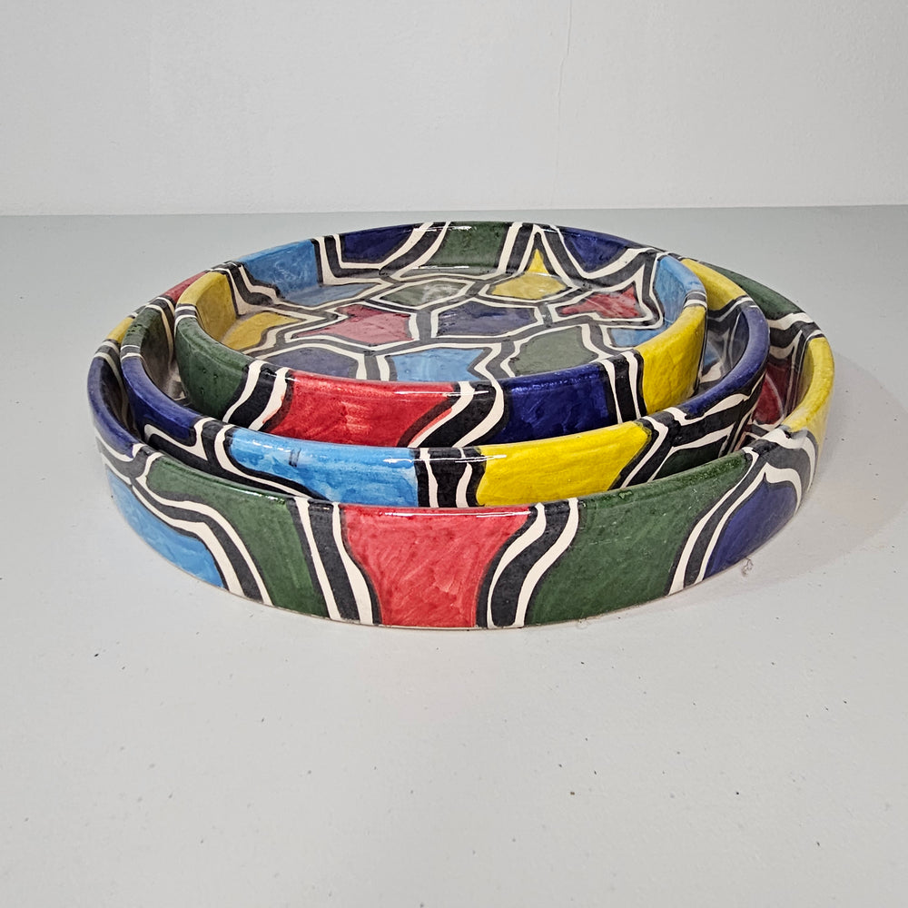 Let the joy of Moroccan colors brighten your table with the "Festival Zellige" set: three bowls with vibrant patterns that celebrate the richness of Berber craftsmanship. Perfect for serving appetizers, fruit, or desserts, these pieces bring a festive and warm touch to your gatherings or everyday snacks.