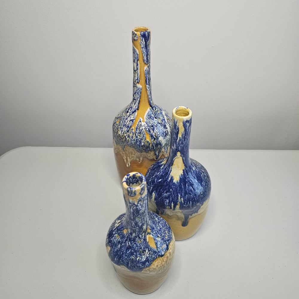 Treat yourself to the mineral poetry of our Trio of Ochre Sapphire Blue Vases , each handcrafted by Moroccan artisans. Here, the ochre earth embraces the deep blue of the enamel, evoking the contrasting landscapes of the Atlas Mountains and skies.