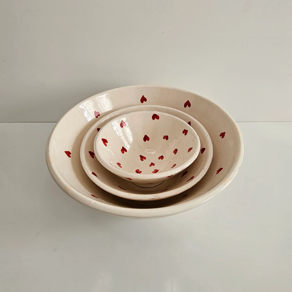 Celebrate the joys of sweet treats with the "Tayri Hearts" bowl set. Each of these three Moroccan ceramic bowls is hand-decorated with small red hearts, expressing generosity and conviviality at dessert or snack time.
