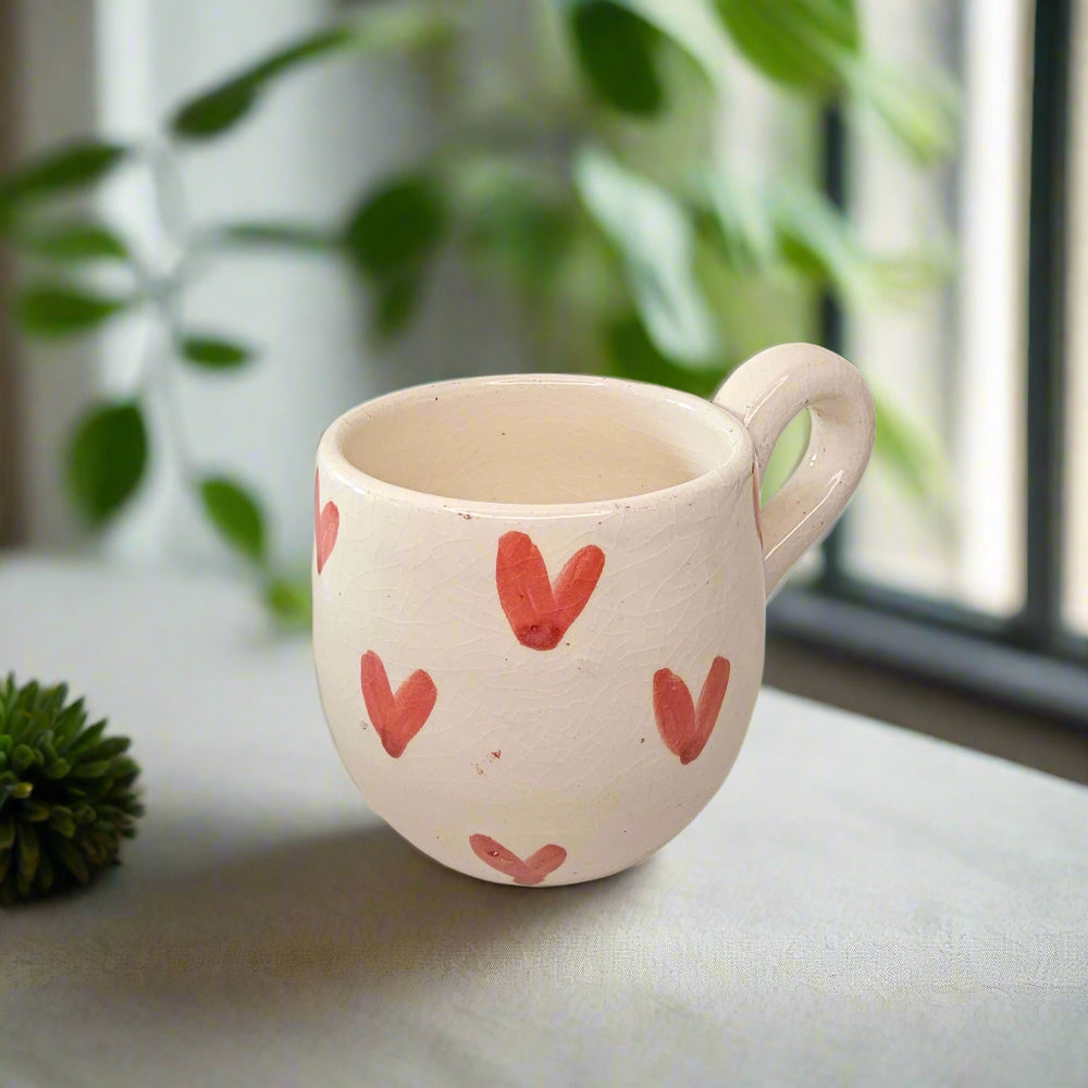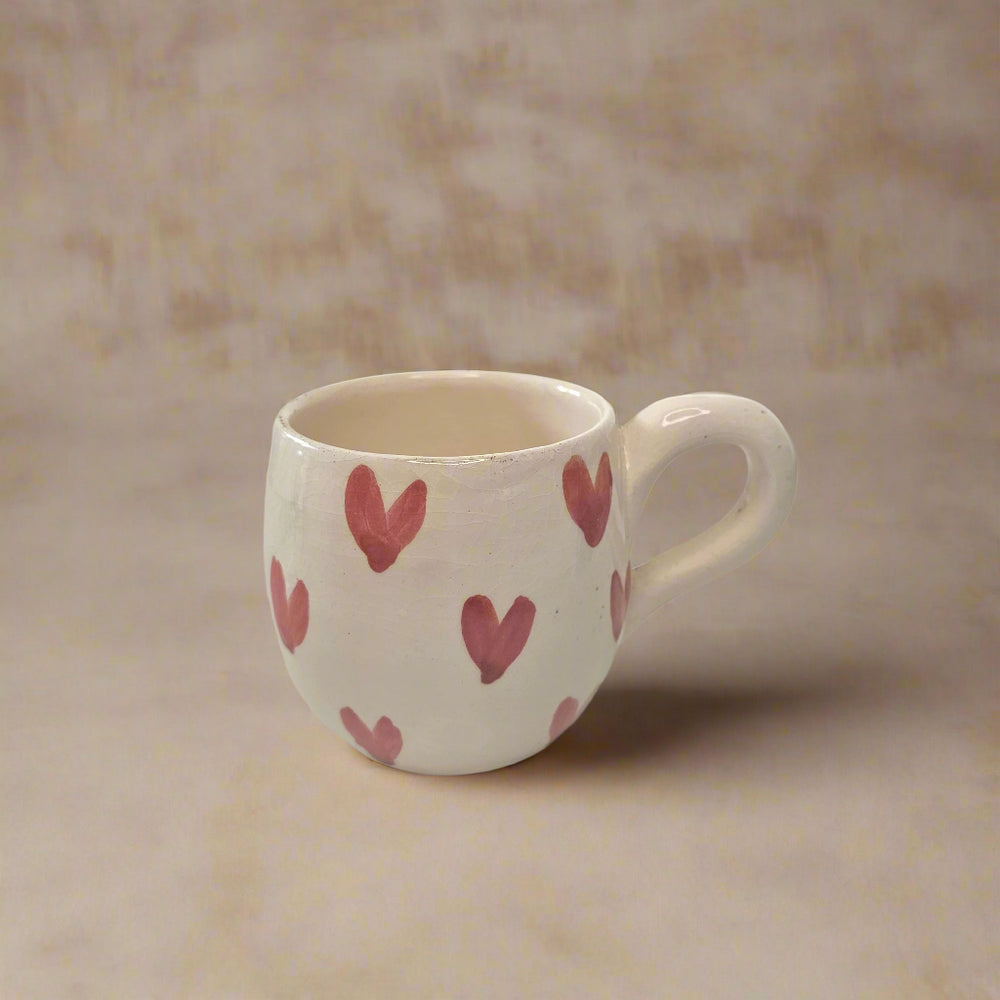 Savor your morning as if you were in the heart of a Moroccan riad with the "Tayri Hearts" mug. Its medium size and subtle texture, dotted with small hand-painted red hearts, celebrate the generosity and joy of Amazigh life. A handmade mug with authentic charm, perfect for enhancing coffees and infusions in a soft and refined atmosphere.