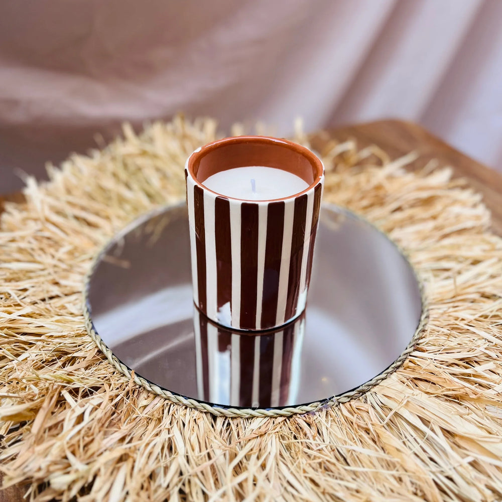 The Lueur Tayri candle combines scented wax with a handmade ceramic pot. Heart motifs or deep green enamel transform each candle into a decorative object that you can reuse once the wax has melted.