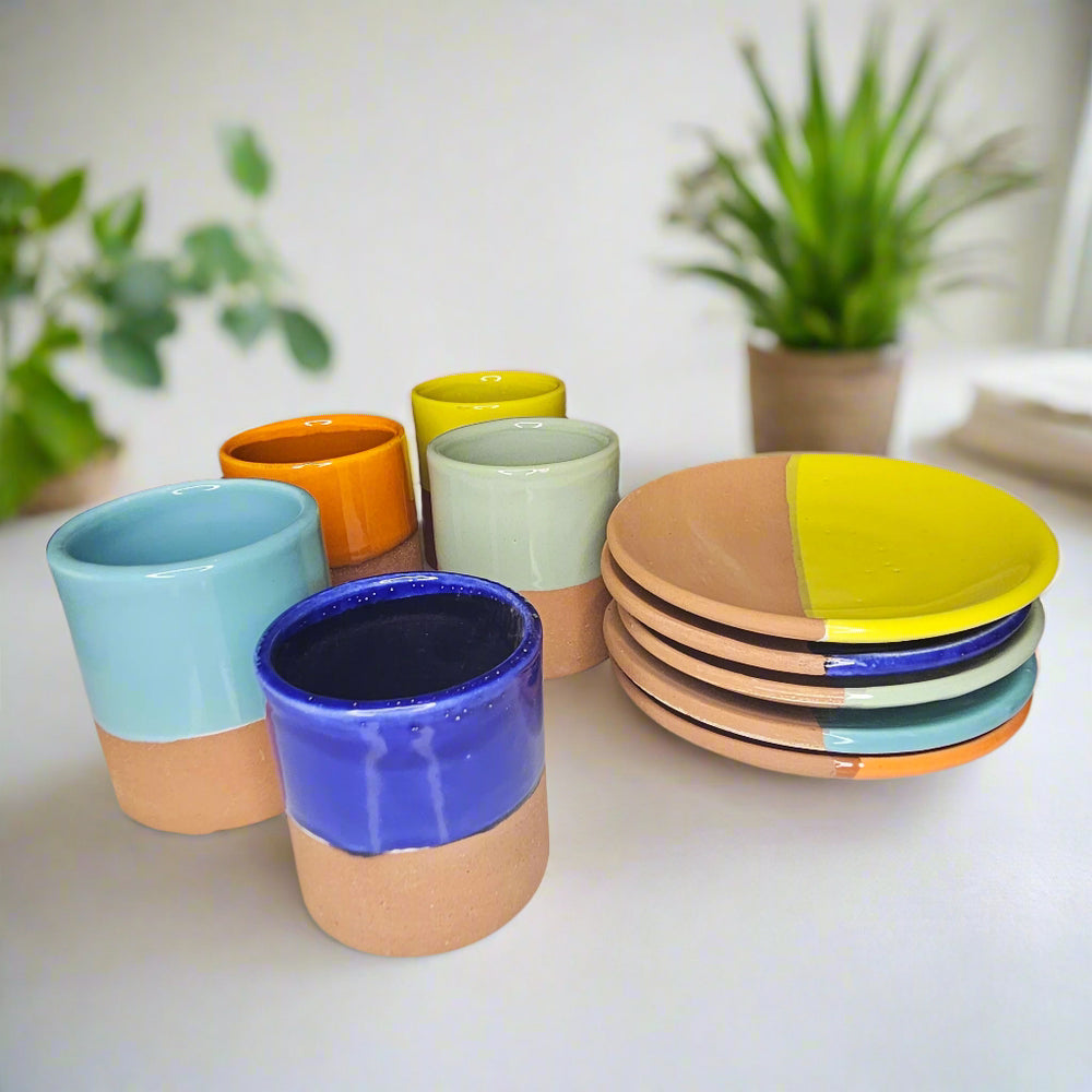 Take your senses and your décor on a journey with the "Tazrart" set: five cups and saucers in vibrant colors, named after the hues and light of Morocco. Each pair celebrates artisanal elegance and modernity, uniting the energy of colorful glazes with the warmth of terracotta and the refined skill of the potter.