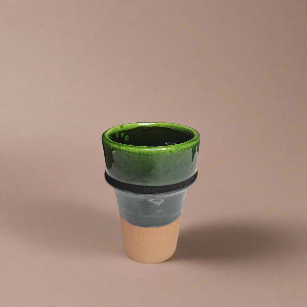 Let the morning light caress your senses with the "Amazigh Tamgroute" mug. Its tall silhouette and contrasting colors—olive green or deep black and mineral earth—evokate sun-drenched Berber gardens. Handcrafted, each mug celebrates Moroccan heritage in a generous shape ideal for long coffees, hot chocolates, or flavored teas.