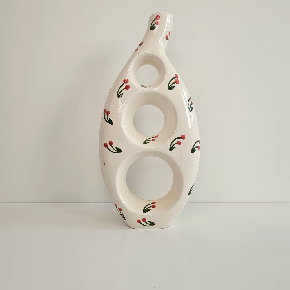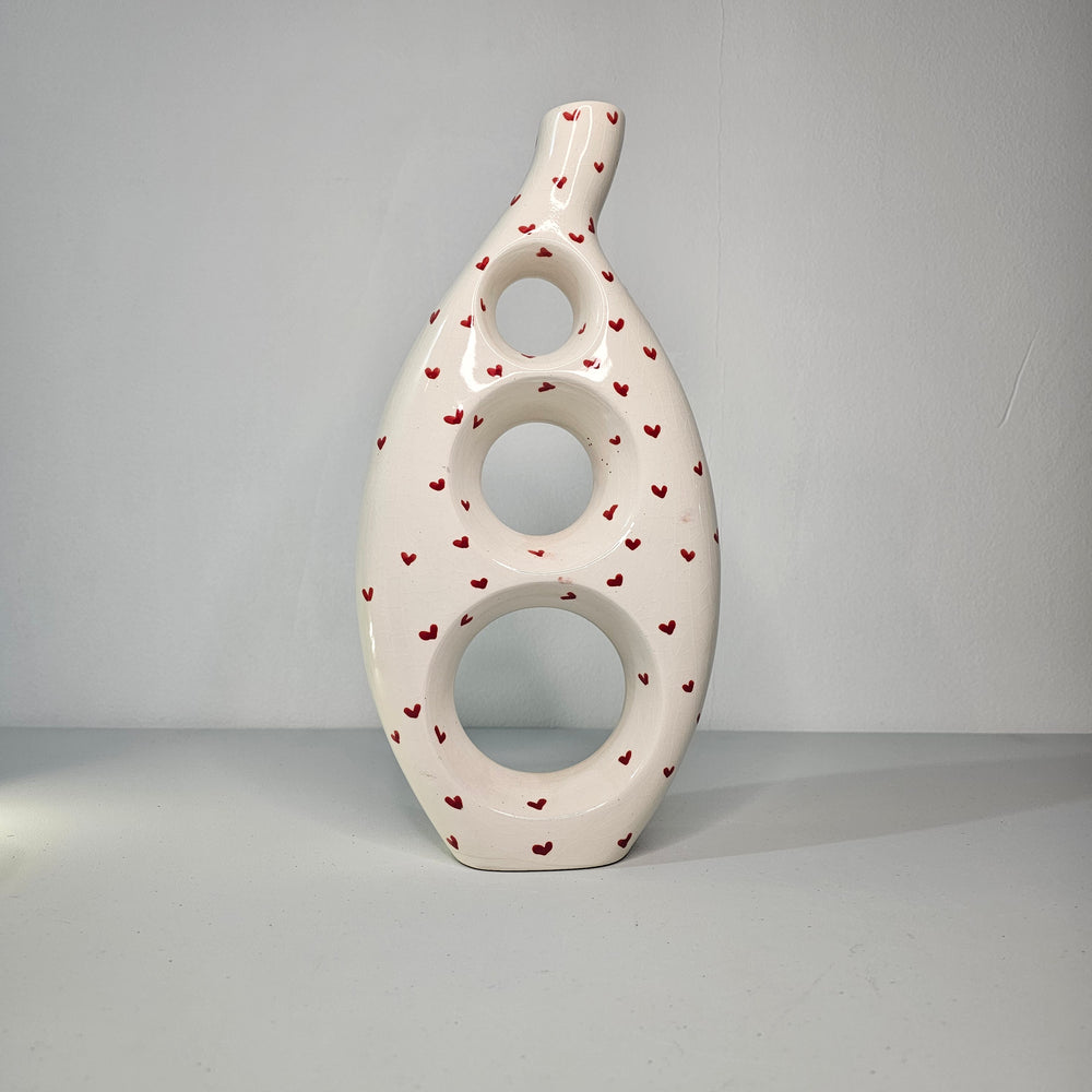 Bring Berber creativity into your decor with the "Oulmès" vase. Its openwork, graphic shape is entirely handmade, for a unique and luminous sculptural presence. Available in four vibrant finishes: floral white, white with red hearts, Majorelle blue, and saffron yellow, this vase celebrates modernity and Moroccan culture in a contemporary interpretation.