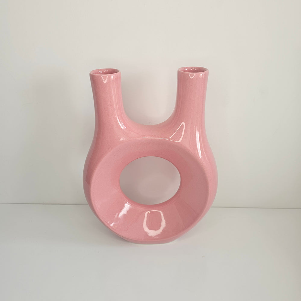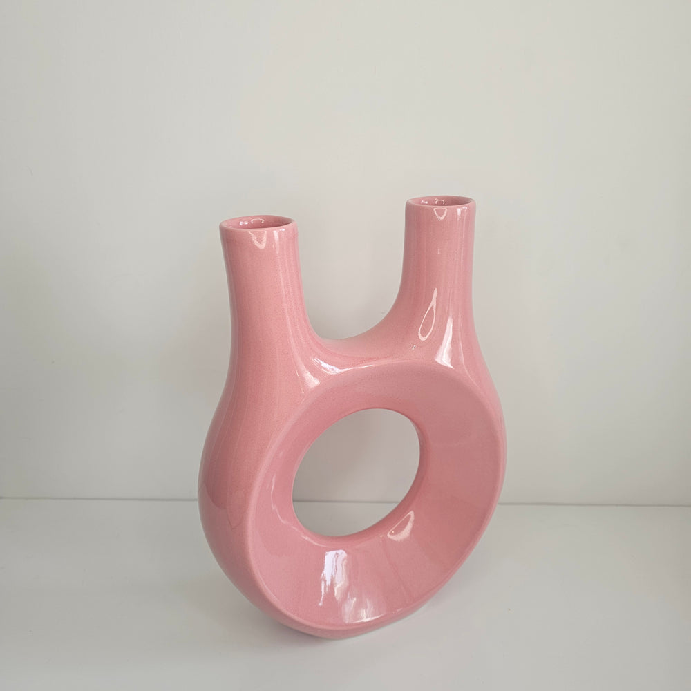 Discover poetic modernity with the "Amazigh Luna Rose" vase. Its graphic shape with a double neck and central opening, entirely handmade, makes it a unique piece at the heart of your decor. Its powder pink finish brightens the space with softness and boldness, merging Amazigh tradition and avant-garde design.