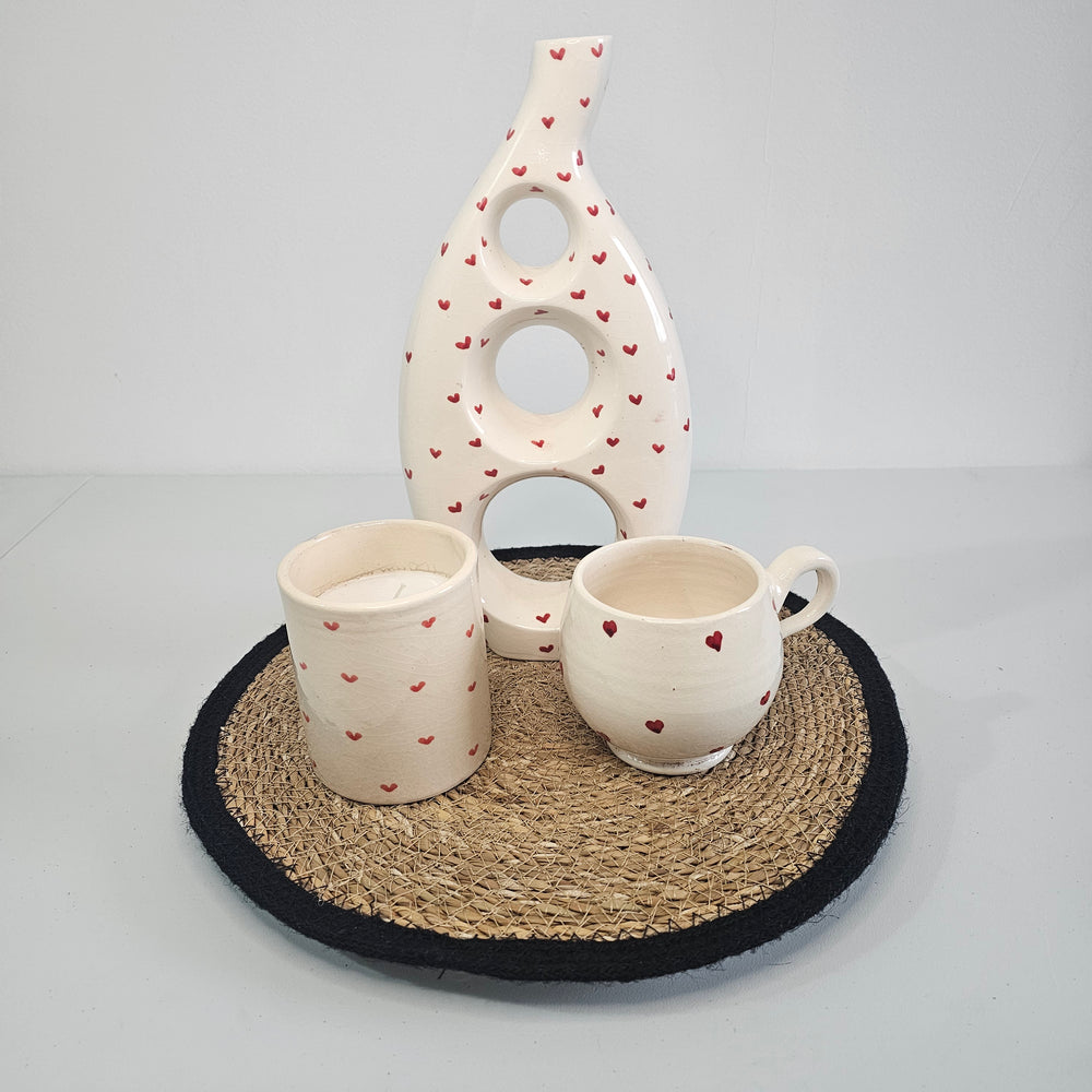 Offrez un moment de tendresse avec le Coffret Cadeau Tayri, pensé comme un rituel clé en main. Ce coffret réunit le vase sculpture design, une bougie parfumée et un mug assorti, tous en céramique blanche parsemée de petits cœurs rouges.