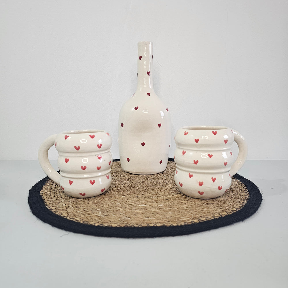 Ce coffret réunit trois pièces de la collection Tayri pour un moment du quotidien plein de douceur : un Vase en céramique qui fait aussi bouteille et deux mugs côtelés assortis, tous en blanc ponctué de petits cœurs rouges. Un trio chaleureux pour le café du matin, le goûter ou une table romantique.